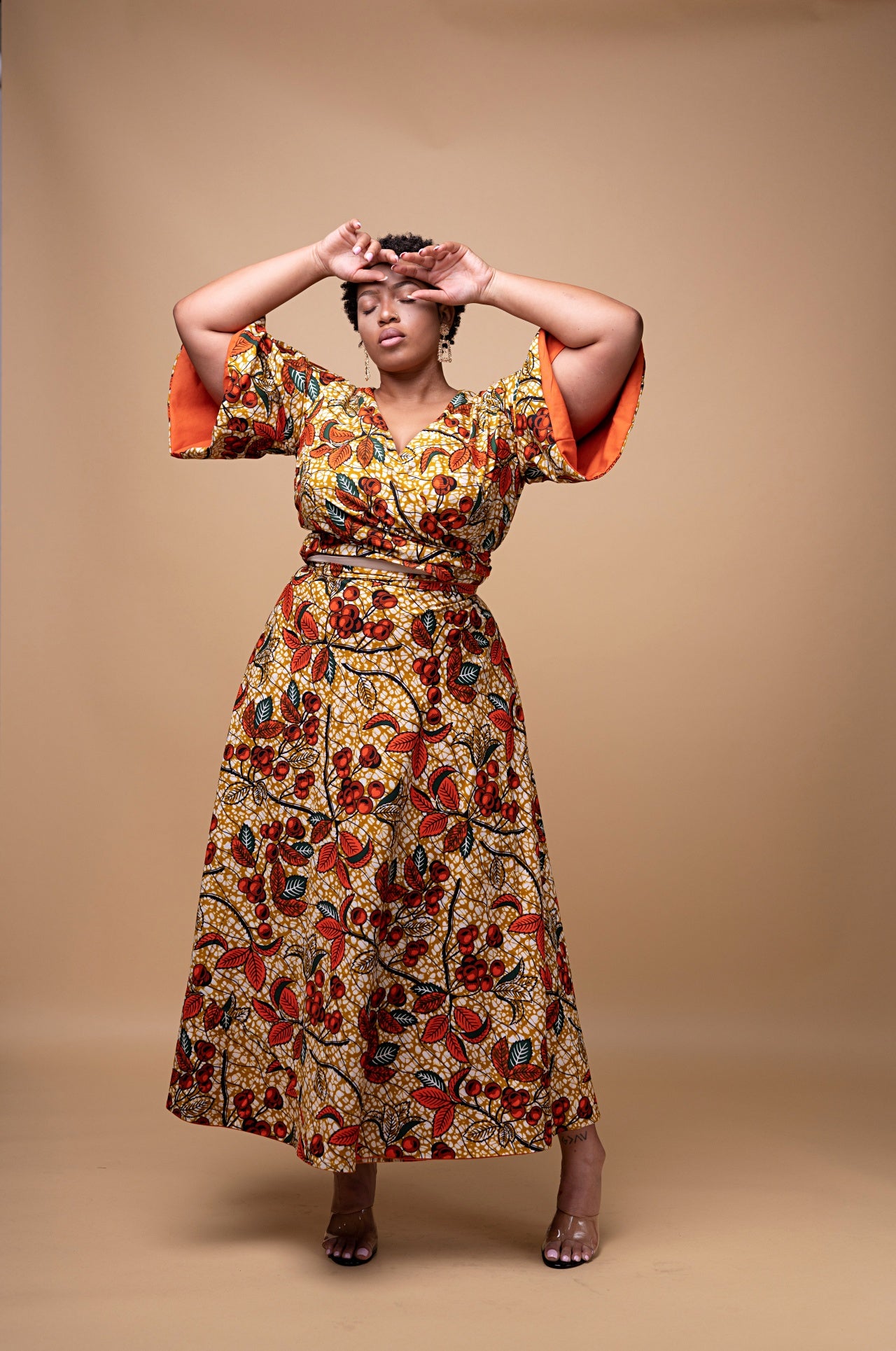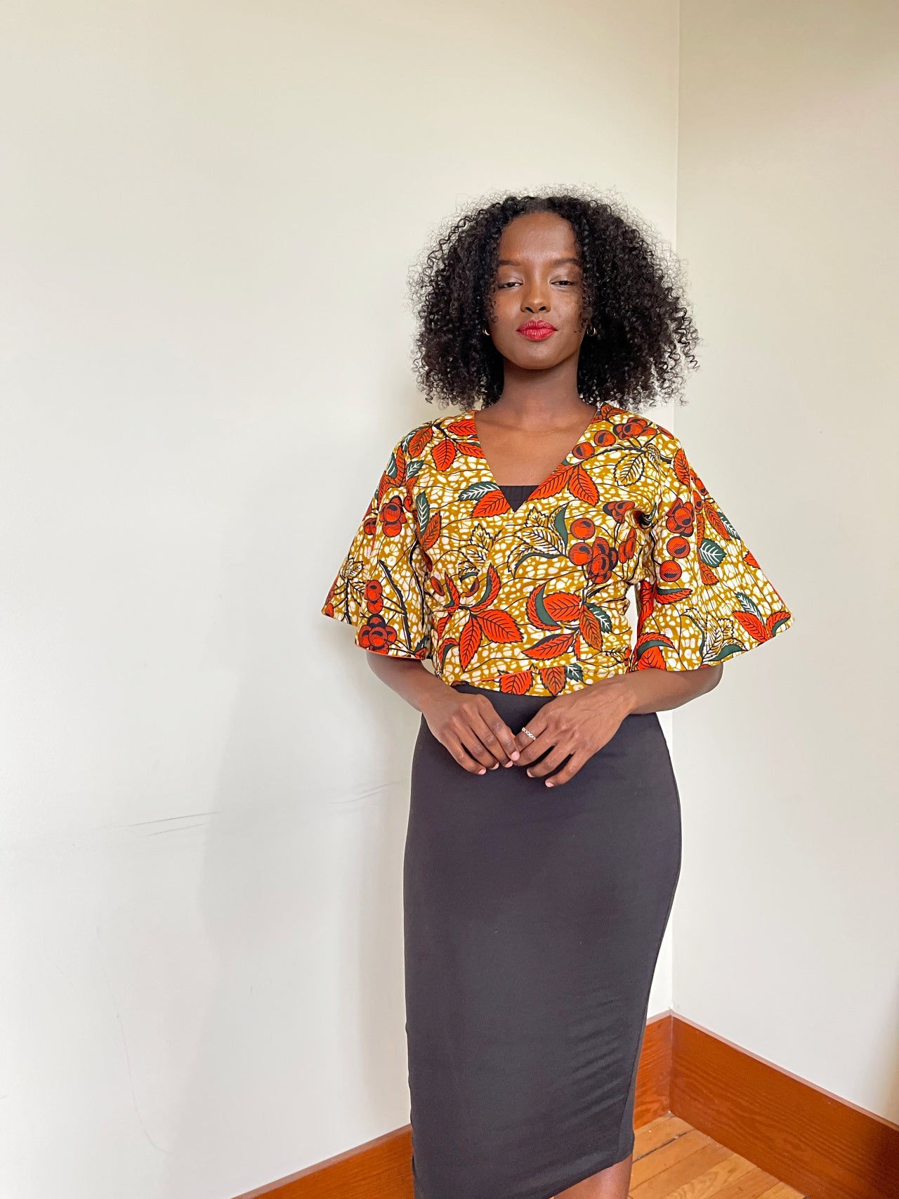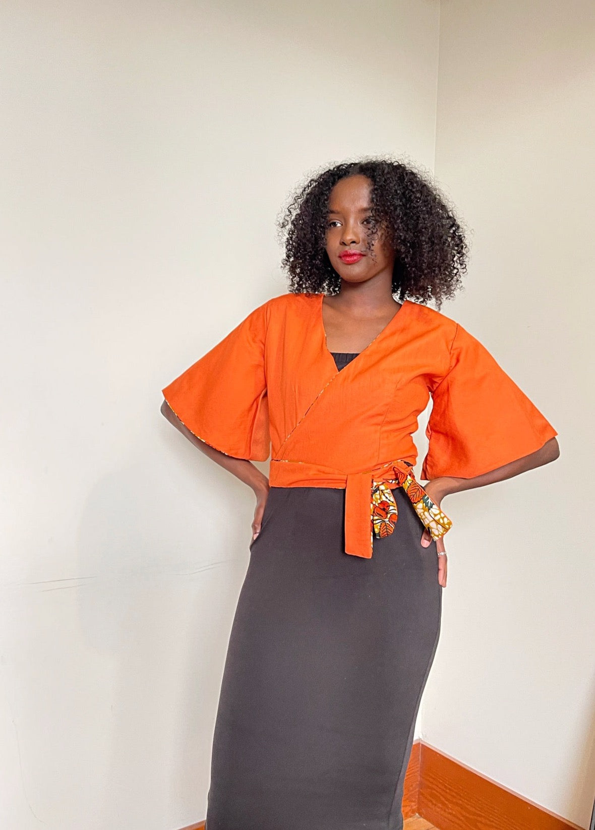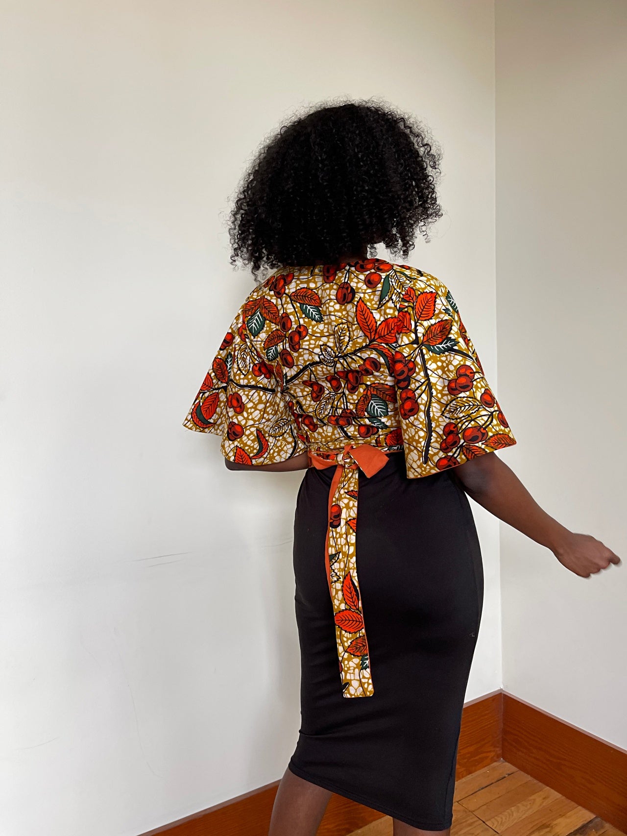 Get the most wear with this 2-in-1 reversible wrap blouse. The bright Keeya floral African Print is cleverly layered with a beautiful orange tone, giving you the option of wearing it either way. Want more styling options, try tying the wrap blouse backwards (tutorial in gallery). Pair with the Keeya Reversible Wrap Skirt for a matching set.