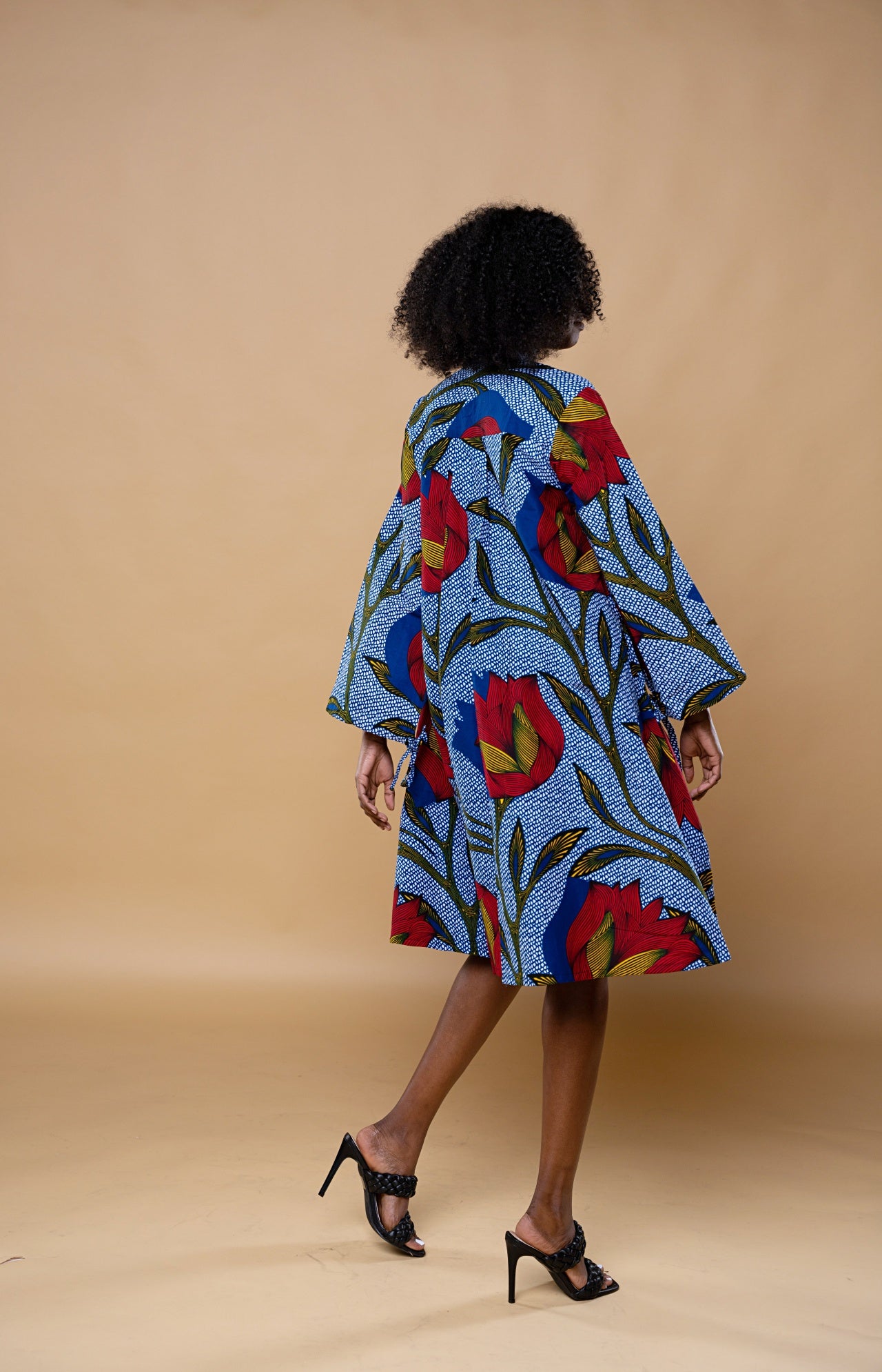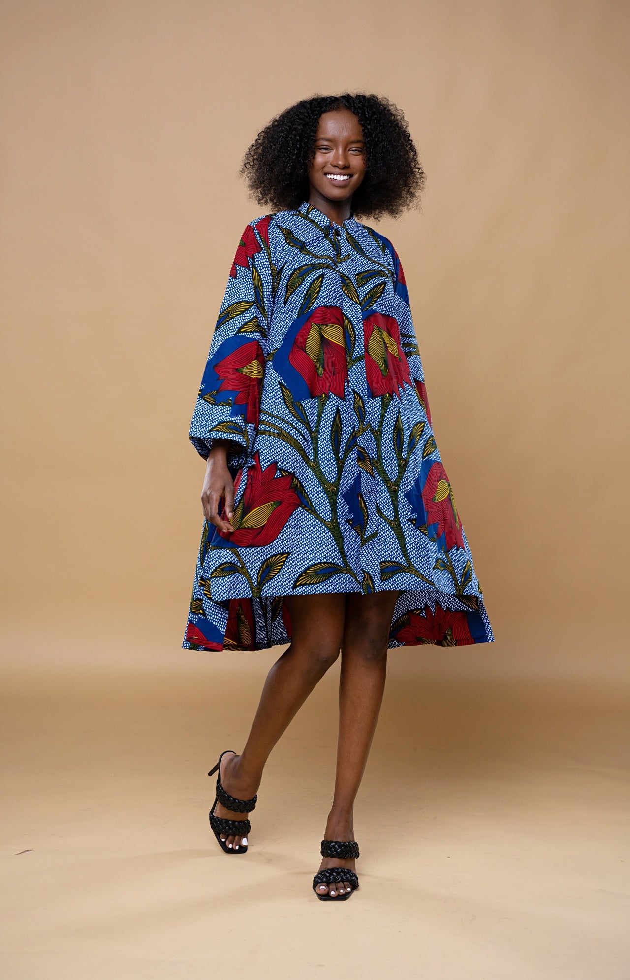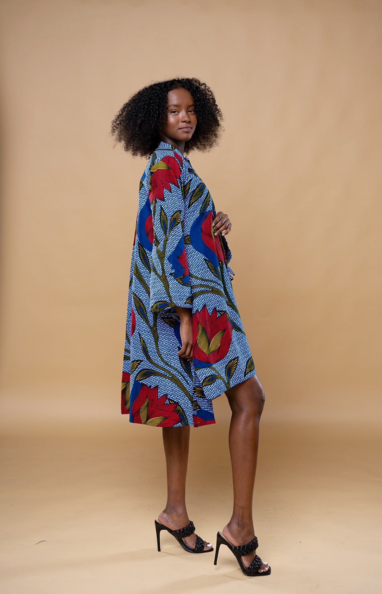 Embrace timeless elegance with our Floral Oversized Shirt Dress, a harmonious blend of classic design and vibrant African print. Crafted from 100% breathable cotton, this dress features a sophisticated mandarin collar, adjustable self-tie sleeves, and a hidden button placket for a seamless look. The high-low split hem adds a contemporary flair, while side pockets offer practicality. Whether worn belted, loose, or layered over denim, this versatile piece ensures comfort and chic style for any occasion.