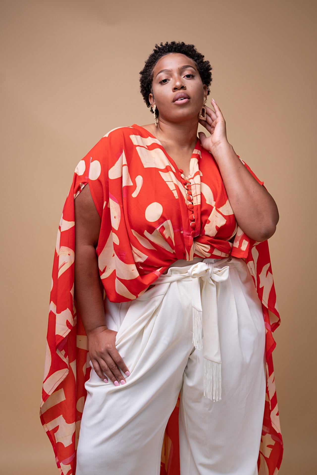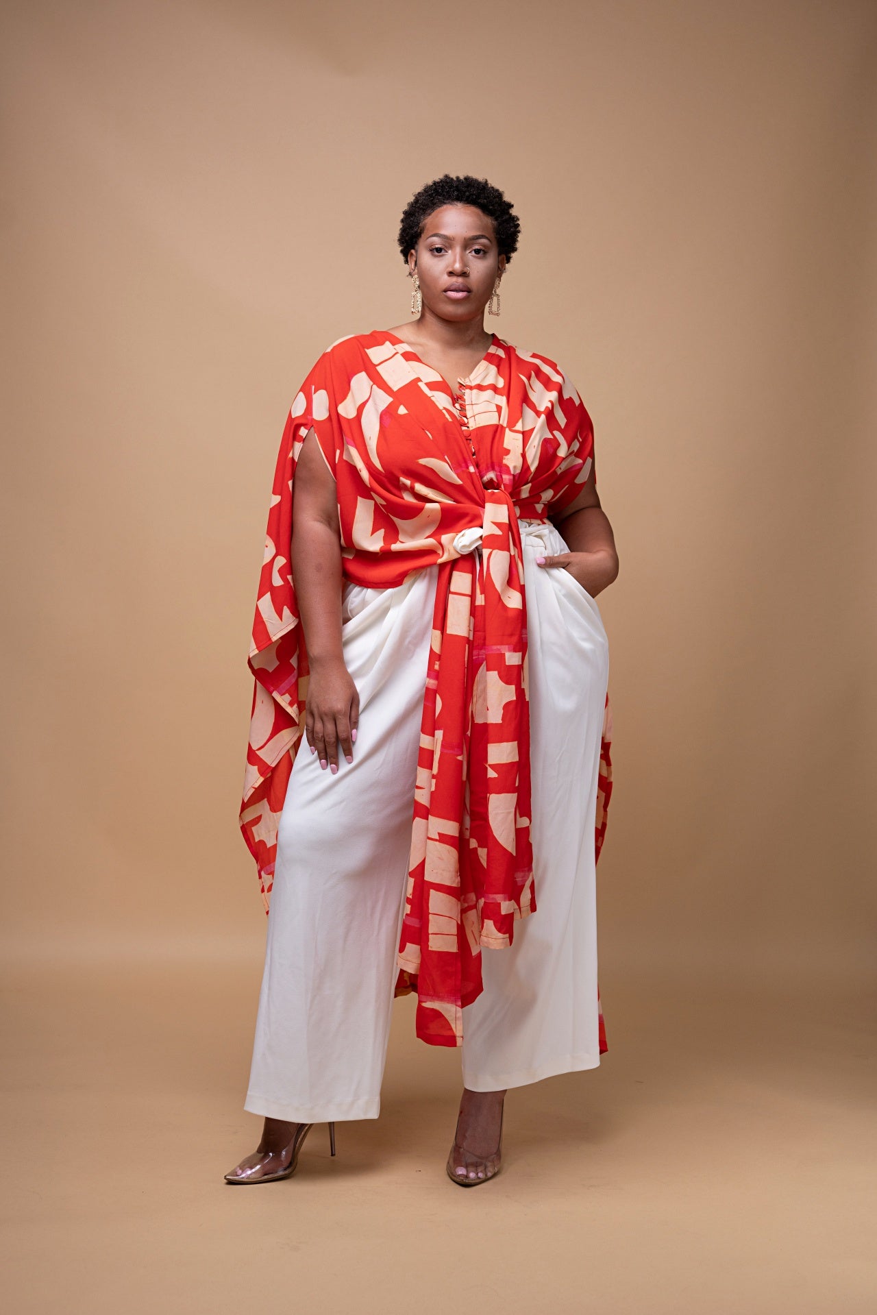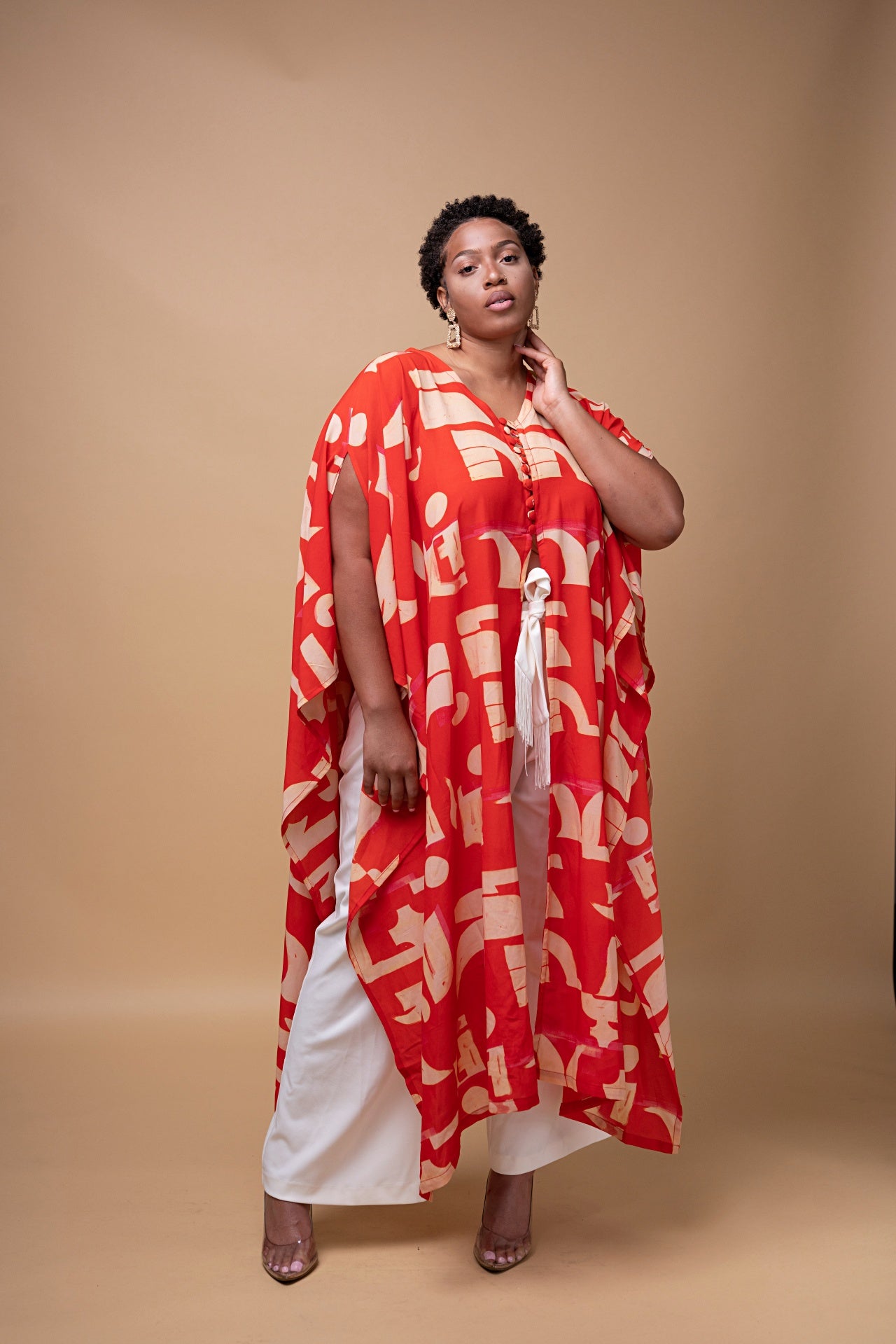 Step in like royalty in this gracious semi-sheer, multi-way kaftan. It’s asymmetric hemline, and unique print makes this one a show stopper. Button up the chest with these beautiful custom fabric cover buttons and loops. Choose from two size lengths, a full ‘58 inches as or reduce the length to ‘52 inches.