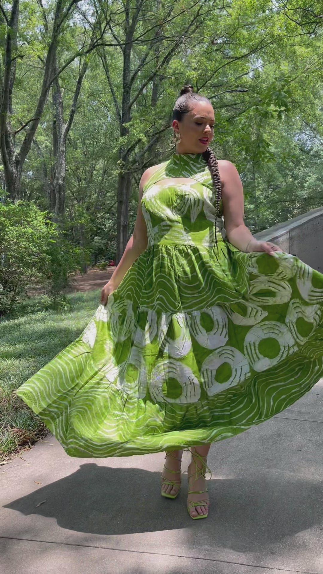 Grace your body in the ultimate statement dress, the perfect fusion of two mesmerizing prints - the Ala and dreams print. The dress is crafted with 3 tiers and layers, adding depth and dimension to the overall look. The halter neckline features a daring cutout at the front, adding a touch of boldness to the feminine silhouette. With a back zipper for easy wear, this dress is not only beautiful but also effortless to slip into. Radiate elegance and charm in this one-of-a-kind dress, guaranteed to turn heads wherever you go. Also available in orange.