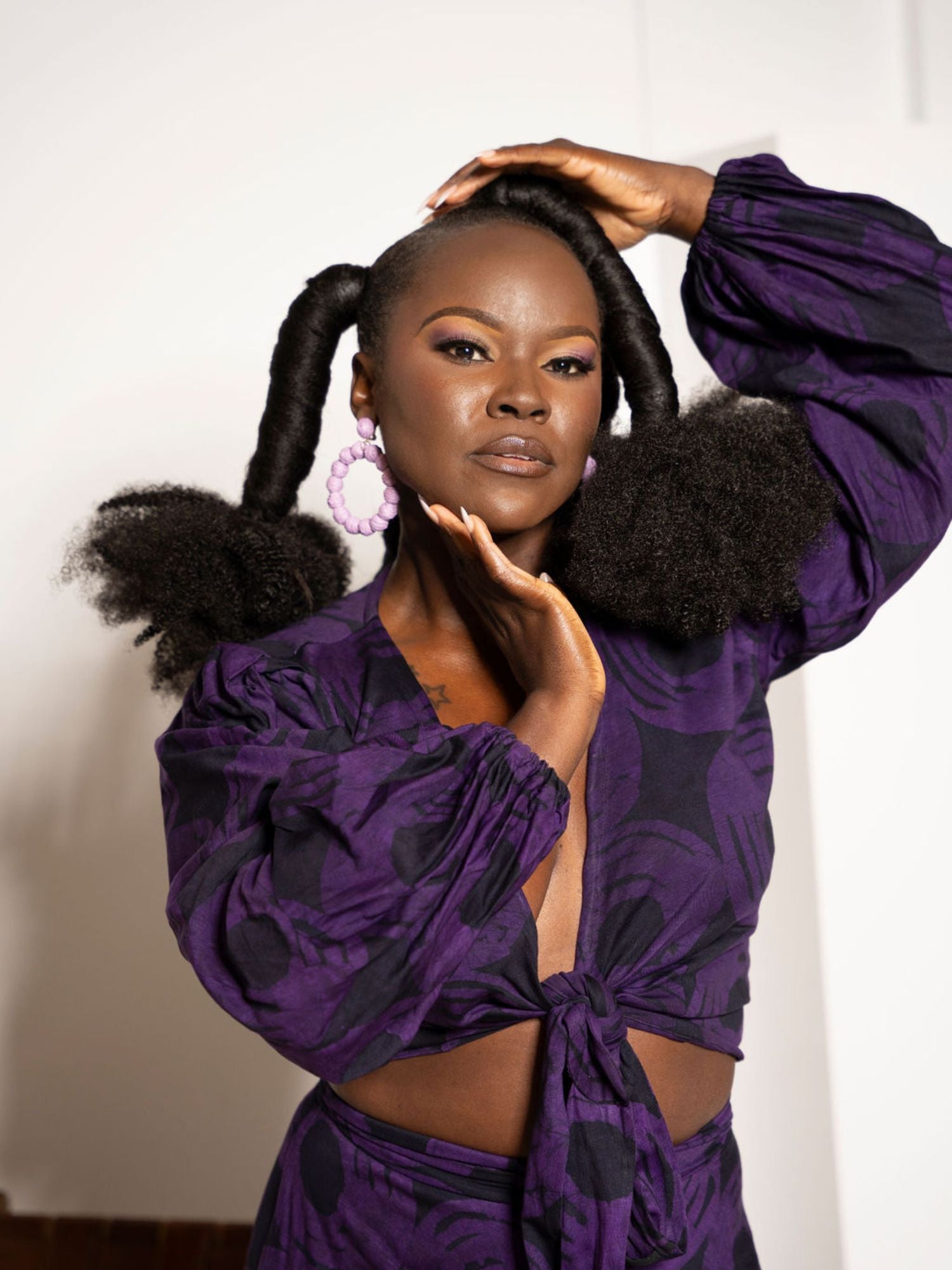 This true wrap blouse features long lantern sleeves with elastic cuffs and adjustable ties that can be worn in front or back. Wrap it around for full coverage, or tie in the front for more sass. Pair with the Makidada Wrap Skirt for a chic and coordinating ensemble.